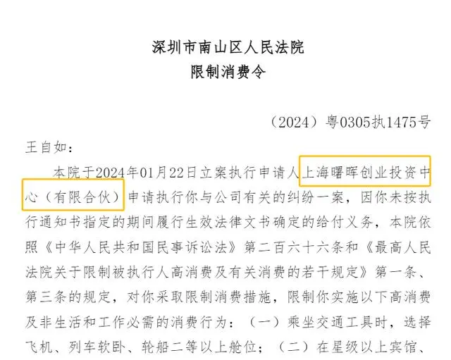 企查查显示,近日,王自如因未按执行通知书指定的期间履行生效法律文书确定的给付义务,被深圳市南山区人民法院采取限制消费措施。根据案件流程信息,今年1月,王自如已因此案被强制执行3383余万元。