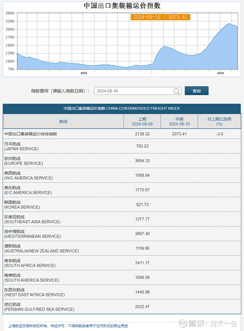 2024年8月16,中国出口集装箱运价指数CCFI为2073.41,比上周下跌3%。
