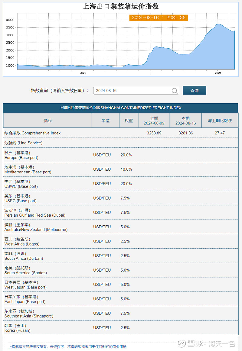上海出口集装箱运价指数SCFI为3281.36,比上周上涨27.47,涨幅0.8%。(轮到SCFI蚊子腿上涨了,意外吧)