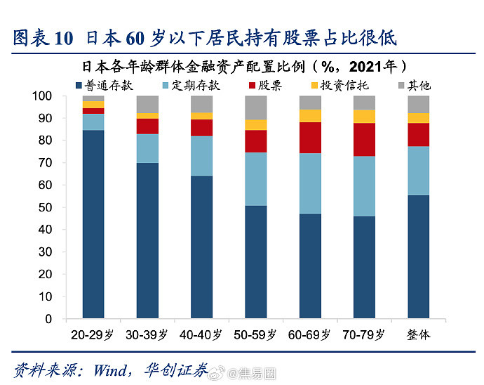 😔在2021年日本居民的金融资产配置中,60岁以上群体股票占比最高,而1990年泡沫破裂之后出生的年轻人,如20 - 29岁的年轻群体所持股票占比仅2.5%,他们几乎与股市无缘。