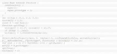 在一个不存在的 arr 变量上定义了一个 getter,以在调用 prototype getter 时操纵 victim[1],结合一个大循环操作 victim 元素和最终的类型转换,使用可能由攻击者控制的‘flag’,创造了一个环境,在这种环境下,写入 arr[0] 可能会覆盖另一个对象的 prototype,其值为 victim[1],从而导致意外行为的发生。