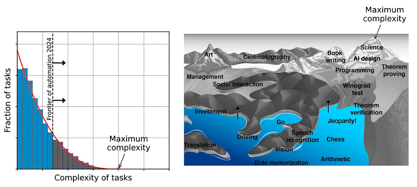 The economists Anton Korinek & Donghyun Suh (2024) have created a model specifically considering why humans might run out of new tasks in the face of AGI and what would happen to wages in such a scenario. Their basic approach is that all possible tasks that could be performed by humans are ordered in terms of computational complexity and as digital computation expands more and more tasks can be automated moving the automation frontier from left to right. This is essentially a restatement of Moravec’s metaphorical landscape of human competences and automation (see figure below). In this metaphor the peaks reflect the most complex human competences, whereas AI automation is represented as a rising tide that continuously moves the shore line up.