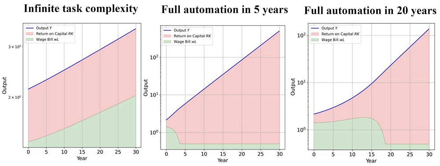 If the complexity of economic tasks performed by humans is bounded (in other words, if there is no infinitely high mountain in Moravec’s landscape of human competences), automation will eventually cover all tasks, leading to complete automation. In the short term, automation increases productivity and boosts wages for non-automated tasks. In the long term, humans run out of tasks at which they can outperform machines and the labor share of income collapses fairly steeply as we approach full automation.