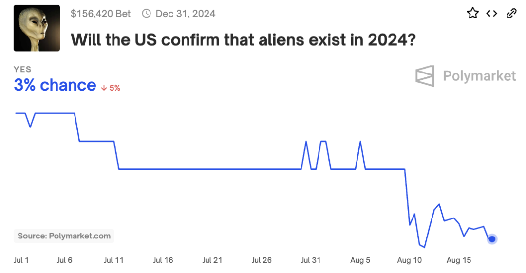 关于美国政府是否会在年底前确认外星人存在,目前累计有超过 10 万美元对此进行押注,但 Polymarket 显示只有 3% 的几率,与预测特朗普在大选日前坐牢的概率差不多。