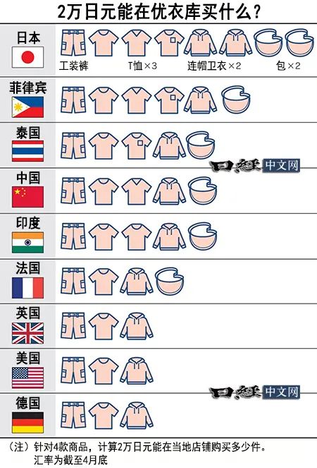 日经调查了2万日元(约合人民币901元)预算可以在优衣库买什么以及可以买多少。结果显示,世界上优衣库最便宜的是日本,能买8件商品。在美国只能买T恤、工装裤、连帽卫衣这3件。在中国能买……
