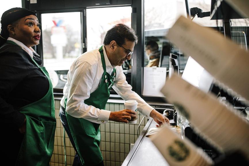 ▲纳拉辛汉在星巴克接受了咖啡师培训,为担任首席执行官的角色做准备