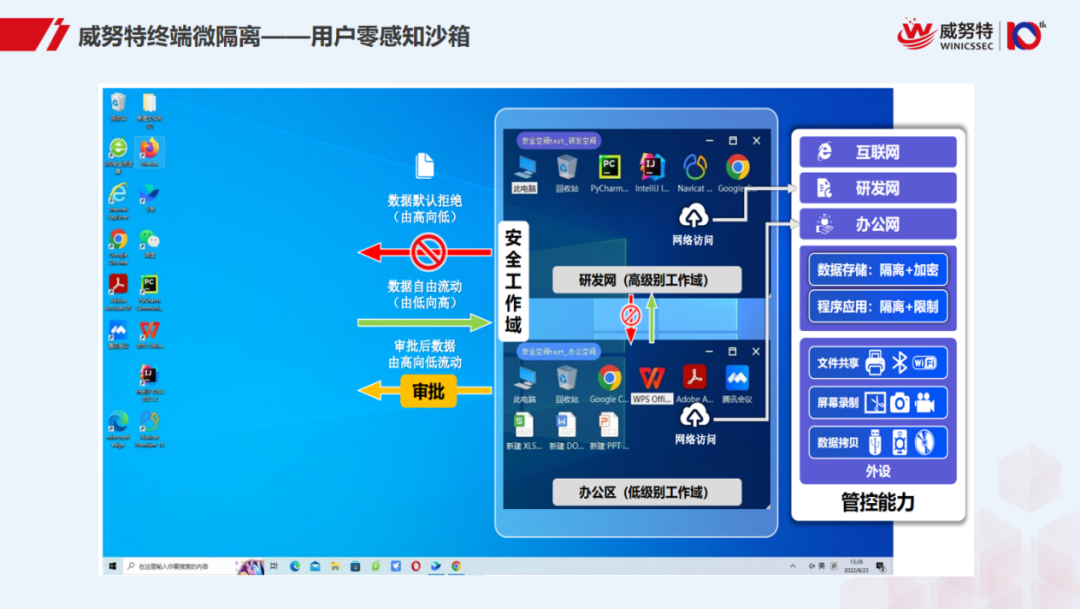 通过下一代沙箱技术,在终端上构建独立的、隔离的安全工作空间,当操作人员在安全工作空间内进行涉密业务操作时,终端沙箱会将所有产生的数据存储到加密磁盘中,并且当出现针对涉密数据的可疑操作行为时,都会被安全工作空间的管理驱动和重定向引擎所接管,重定向至不可见空间,保证了不可见空间数据与个人可见空间数据的隔离以及数据安全性。而对于数据的外发则是需要通过外发审批,以实现跨工作域的数据传输,极大程度上保障了数据采集阶段的安全性。