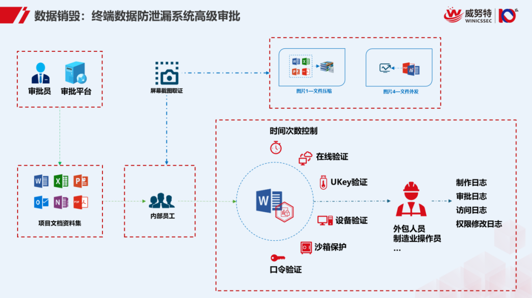 威努特终端数据防泄漏系统能够支持针对数据操作行为的监控审批,如果存在数据销毁等敏感操作,系统会进行自动进行屏幕截图取证并及时阻断转接到外发审批流程,并针对该涉密数据进行多因素认证,综合设备、口令、以及UKey等多方验证信息以确认业务操作是否合理,只有通过多因素认证审批才能把数据外发给外部操作人员,确保每一步操作都可控制、可追溯、可审计,有效防止了数据被恶意或误操作销毁的风险。