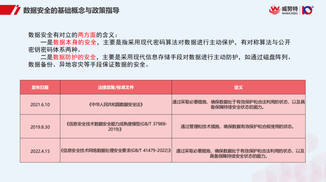 相较于传统网络安全,企业对于更深层次的数据安全没有针对性的了解,再加上相应的管理体系不完善,导致企业数据安全风险激增。这就让我们不得不关注“数据安全”这一基石。首先我们需要明确概念,数据安全是什么?数据安全是对数据全生命周期中机密性、完整性和可用性的全面防护。数据安全分为两大块: