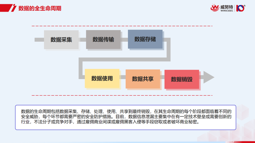 为了保障数据安全,国家出台的《中华人民共和国数据安全法》中提出要采取必要防护措施确保数据处于有效保护,同时针对数据全生命周期都须具备保障持续安全状态的能力。数据的全生命周期包括数据采集、存储、处理、使用、共享以及最终销毁,在其生命周期的每个阶段都面临着不同的安全威胁,每个环节都需要严密的安全防护措施。目前,数据信息泄漏主要集中在制造业、互联网、软件公司等有一定技术壁垒的行业。