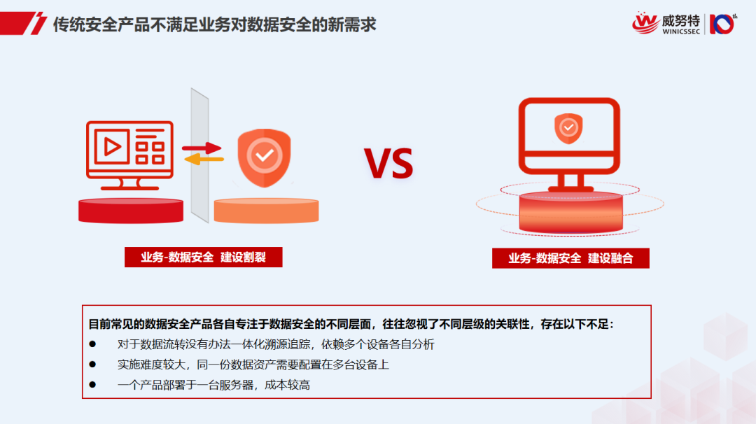 传统的数据安全解决方案通常侧重于数据安全的某个或某几个特定环节,对于形成一个完整的针对数据全生命周期的全流程防护体系来说较难实现。为解决传统数据方案的几大问题,威努特推出了数据安全一站式解决方案,通过七大核心产品组件进行产品间联动,实现一体化溯源追踪;同时共享数据资产,提高各阶段共享数据利用率;并采用软硬件结合的方式,灵活部署,以实现数据全生命周期防护。