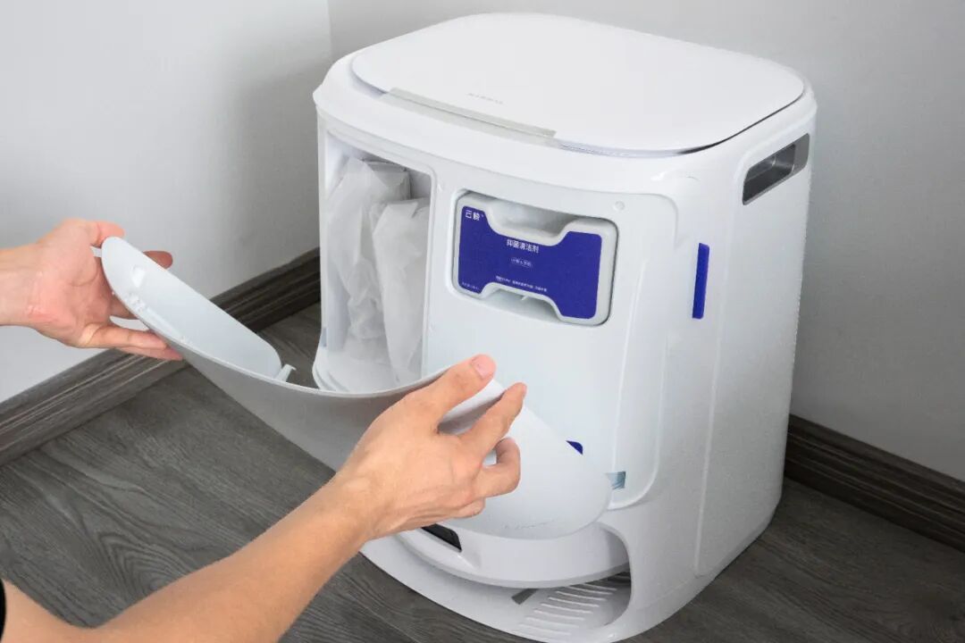 针对这些出现的问题,云鲸 J5 延续了以往的机器人轻集尘系统,除了对毛发使用压缩处理,来提升容积率之外,也在尘仓中搭载了温湿度传感器,无需人手动介入操作,在返回基站后云鲸 J5 会自动根据对应的信息处理垃圾,直到干爽为止。