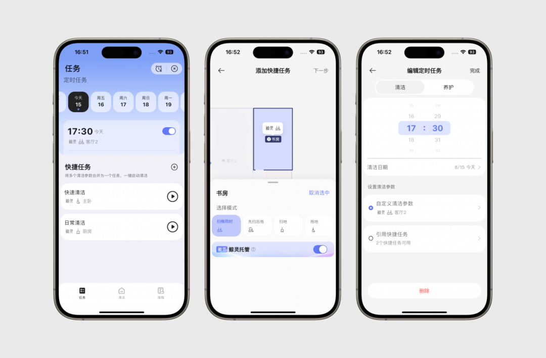 说到自主进行任务,云鲸智能 App 中还有类似智能手机自动化操作的定制任务功能,可以以日历视图的方式,自主定制未来每天的周期性任务:包括类似厨房/客厅这些会更快比其他房间产生脏污的区域,单独定制更高频次的周期清洁,亦或是只指定周期性的清洁时间,剩下的让鲸灵托管帮你自主决策,都可以在这里实现。