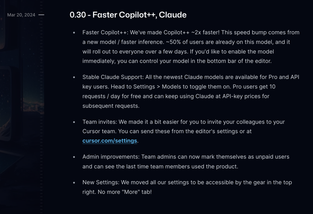 从去年年初发布至今,Cursor 经历了 3 次重大的版本更新和近 40 次的功能迭代,不断引入新的 AI 模型、优化用户界面和体验、增强性能和安全性等。