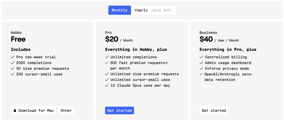 免费计划(Hobby 计划):用户可以免费体验两周,享受每月 2000 个代码补全、50 个慢速优先的高级请求和 200 次使用 cursor-small 模型的数。