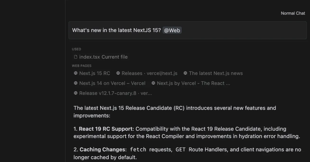 使用 @Web 从互联网上获取最新信息|图片来源:Cursor 官网