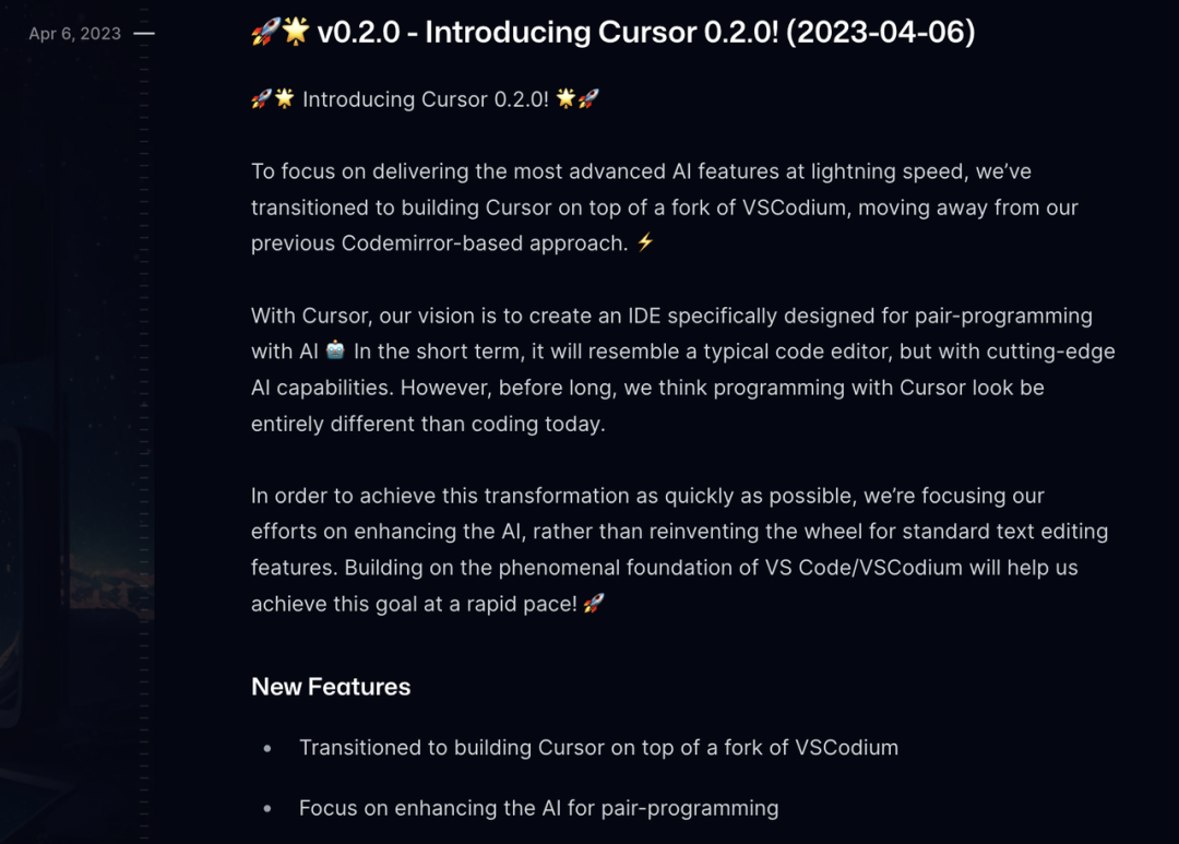 最初,Cursor 基于 Codemirror 构建,但为了专注于开发尖端 AI 功能,并打造一个原生支持 AI 配对编程的集成开发环境(AI-native IDE),Anysphere 将 Cursor 迁移至 VSCodium 的一个分支上,即微软 Visual Studio Code(VS Code)的开源版本。