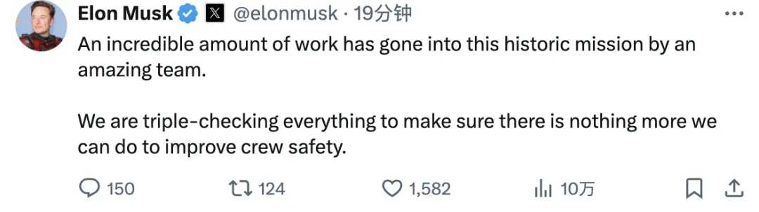 马斯克在其社媒上连续两次表态,称正在对一切进行三重检查,以确保团队无法再做任何事情来提高机组人员的安全。他说:“一支出色的团队为这次历史性任务付出了令人难以置信的努力。”“让我们把星际舰队学院变成现实吧!”