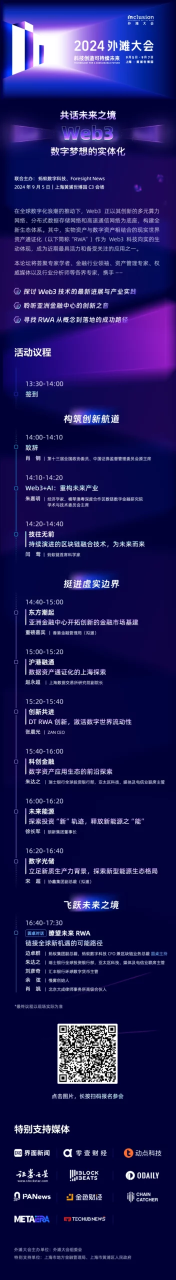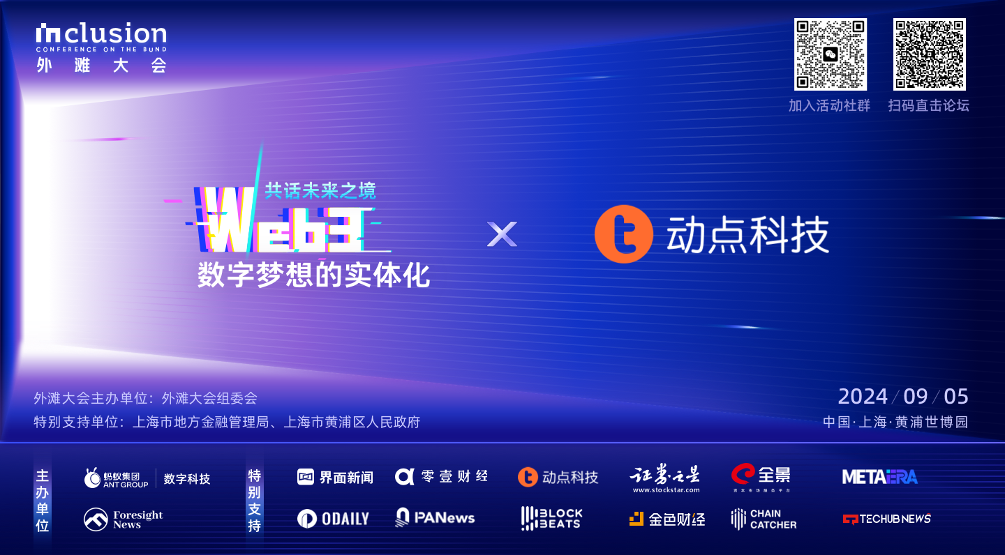 2024 Inclusion·外滩大会,将于9月5日至7日在上海黄浦世博园区隆重举行。动点科技将作为支持媒体特别助力由蚂蚁数字科技、Foresight News 联合主办的“共话未来之境:Web3 数字梦想的‘实体’化”主题论坛。