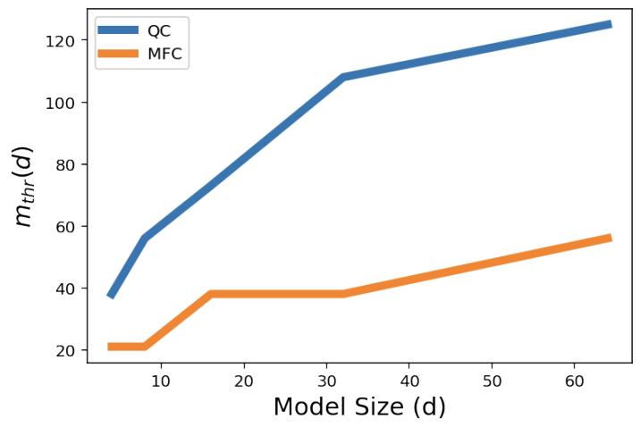 结果显示,对于计数(QC)和找出最高频词(MFC)的任务,m_thr都随嵌入维度d的增大而近似线性增长。