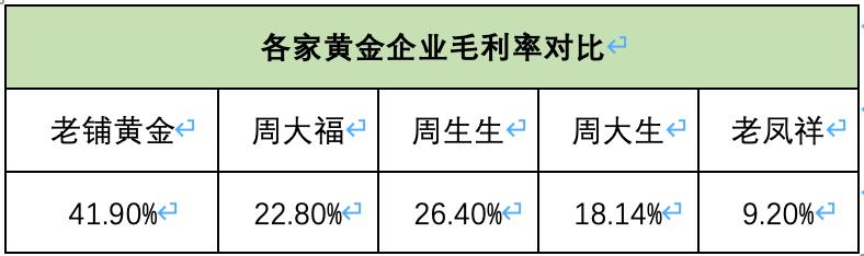 再看各家毛利率,受足金镶嵌产品的带动,老铺黄金坐拥41.9%的毛利率,妥妥行业最高,相比而言,周大福、周生生的毛利率都在30%以下,老凤祥更是只有9.2%。