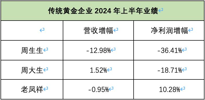 周生生上半年的营收从去年同期的130亿下滑到了113亿,跌幅13%,净利润从8.27亿下滑27%到了5.26亿。老凤祥的收入在上半年出现了微跌,周大生的净利润则同比下跌了18.7%。