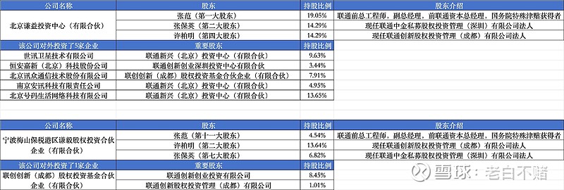 他个人参股的两个投资机构,直接投资了5家通讯技术公司和1家投资公司,而这个6家公司无一例外都是联通投资的,具有一致性和协同性。