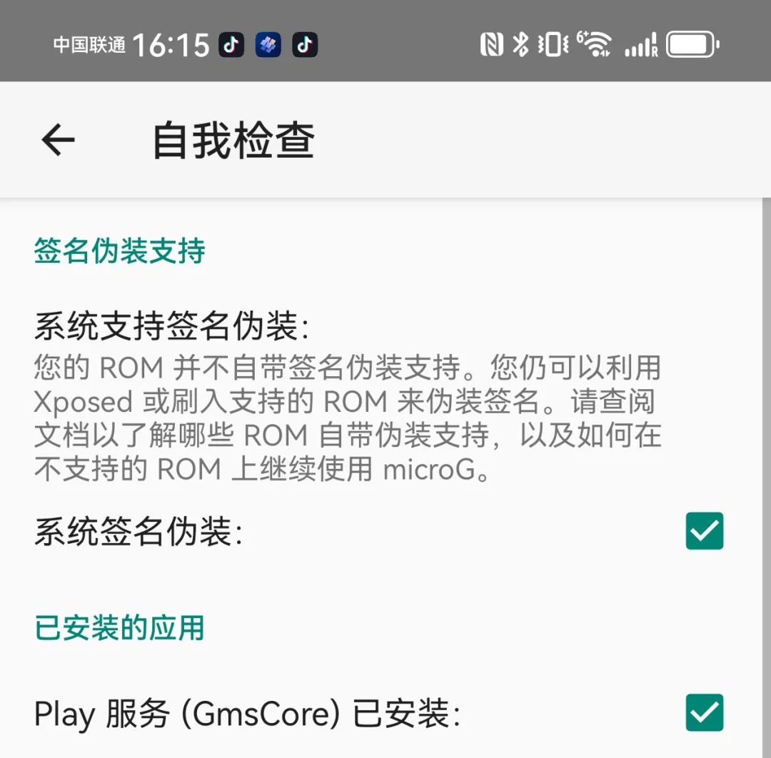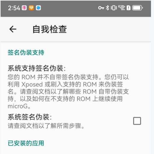 而在国行手机的 HarmonyOS 里,你如果直接从 Mico G 官网下载安装的话,自检页面会提示系统并未支持签名伪装。