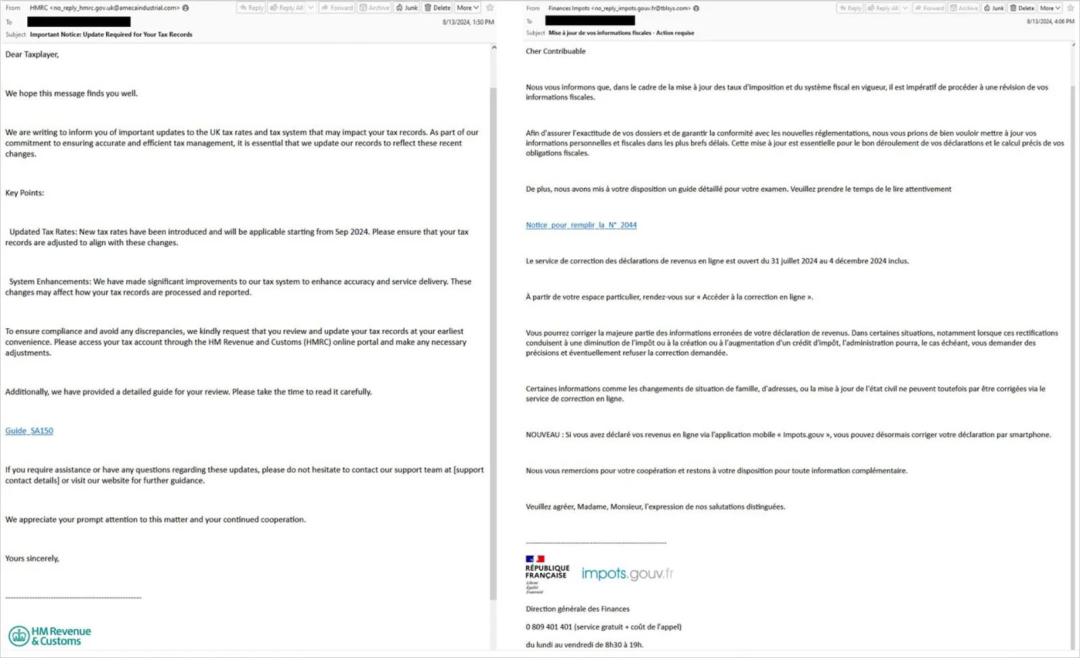 网络钓鱼电子邮件冒充该组织所在国家的税务机关,声称有更新的税务信息并包含相关文件的链接。
