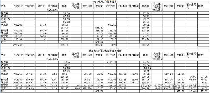 计算的结果,今年8月长江电力发电量同比增加约40(467-427亿度。