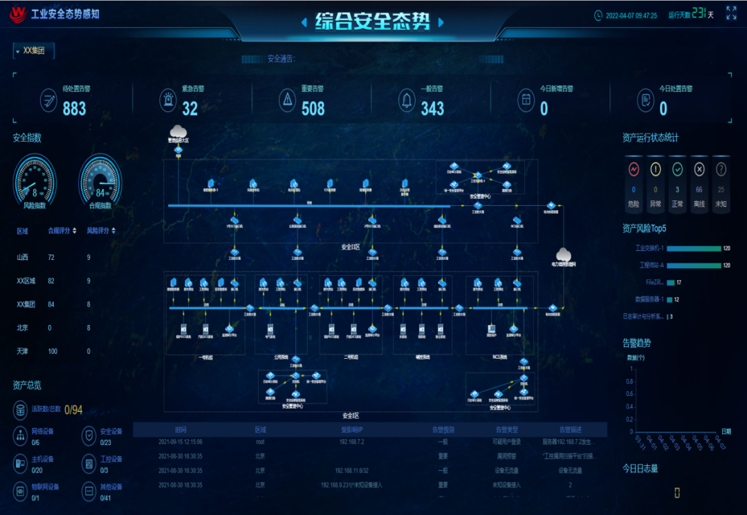 ▪️ 威努特态势感知:此外,在整个化工园区的安全管理中心部署工业态势分析与安全运营管理平台,实时监测园区网络的安全状态,对异常流量、恶意攻击等行为进行预警和处置,同时收集、分析、处理各类安全事件,确保安全事件的及时响应。
