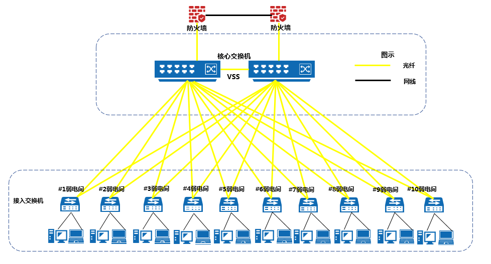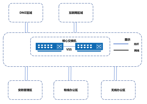 ▪️ 两台威努特核心交换机之间采用多条10G链路互联,并采用VSS技术进行多虚一,消除内网环路,简化内网网络部署,提高网络可靠性的同时,性能提升了一倍;