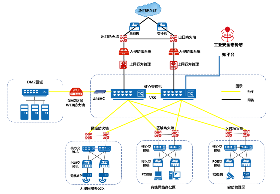 4.全面防护:在核心区域、办公区、安防管理区和互联网接入区均部署了相应的安全设备(如防火墙、入侵防御设备、上网行为管理设备等),实现了对整个园区的全面防护和监控。