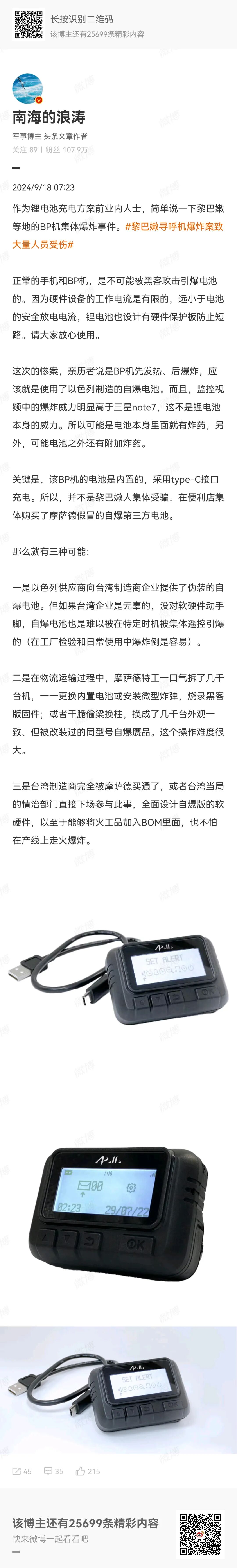 我觉得我们需要关注几个关键问题:1、集中时间点爆炸,怎么才能实现 2、bp机是定向配置,可以收到信息,如果我是黑客我肯定会监控信息获取情报,而不是去引爆 3、bp机为金阿波罗AR-924 它自带的电池 能导致9个死亡这种威力或者说概率吗?