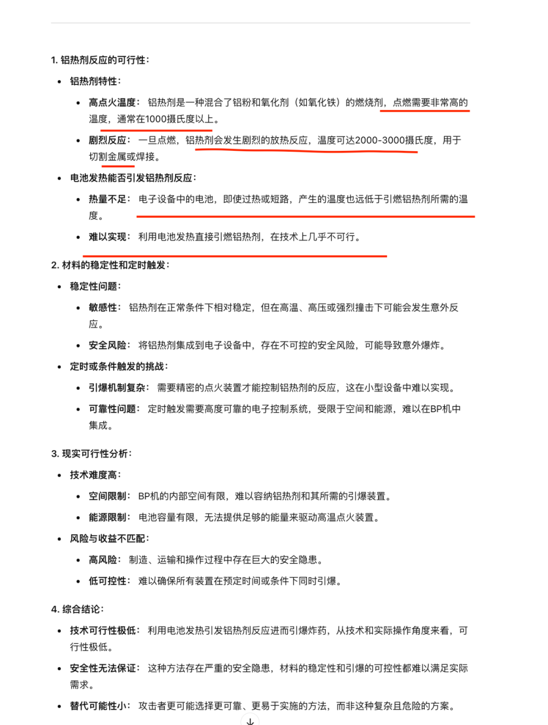 “过热难以实现:即使黑客能够使 BP 机过热,温度可能也不足以引爆塑料炸药。塑料炸药通常需要高温或特定的引爆条件才能被引发。热敏感炸药风险: 如果炸药对温度敏感,理论上可能被过热引爆,但在现实中,通过 BP 机产生足够的热量非常困难。” 有人提出来,是不是可以使用类似于“铝热剂”这种东西实现呢?也就是电池发热引发铝热剂 在引爆炸弹,如果存在这种类似的东西 它的稳定性能做到 定时触发,因为如果不稳定可能随时爆炸的可能