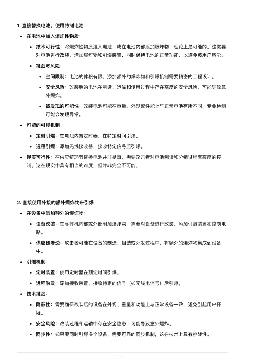 从上面的对话讨论看下来,基本上o1认为问题还是出在供应链做手脚上,至于具体的一些问题,比如“是直接替换电池,使用特制电池:例如,在电池中加入特殊的爆炸性物质。还是直接使用外接的额外爆炸物来引爆。”的问题,我也问了下o1,o1觉得直接替换电池的方案是更靠谱点:
