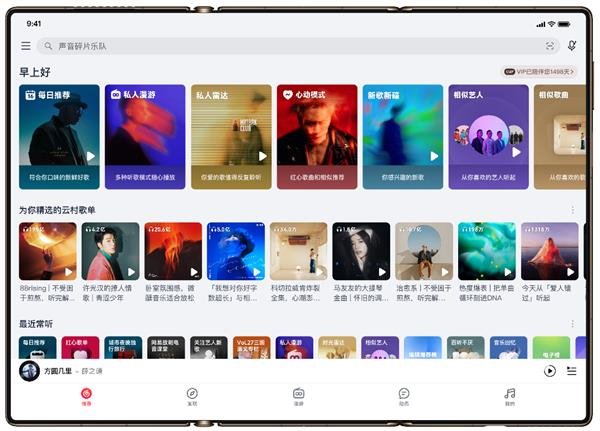 以网易云音乐为例,无论展开双屏还是三屏,网易云音乐都能自适应页面大小,在屏幕左侧显示精美的黑胶封面大图,右侧同步呈现歌词。超大屏幕还可容纳更多音乐内容推荐,让用户无需多次滑动即可尽享好音乐。