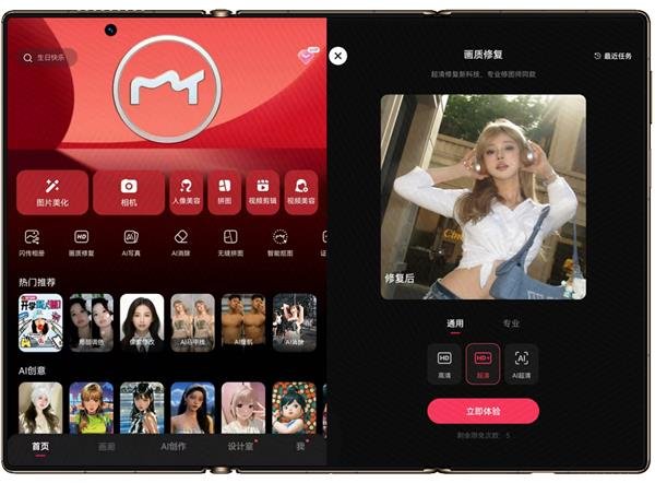 再比如美图秀秀P图时,华为Mate XT 非凡大师展开后会自动切换至宽屏模式,为用户提供更好的自拍画面预览。各类功能模块布局也不再拥挤,修图更加得心应手。在传统大折叠屏领域,华为Mate X5凭借其卓越的设计与性能,至今依然是行业的佼佼者。这款手机采用了超轻薄的四曲折叠机身设计,曲面玻璃屏幕饱满且富有张力,如同玉石般细腻顺滑。而且展开后的厚度仅为5.3mm,比许多直板手机都更为轻便。
