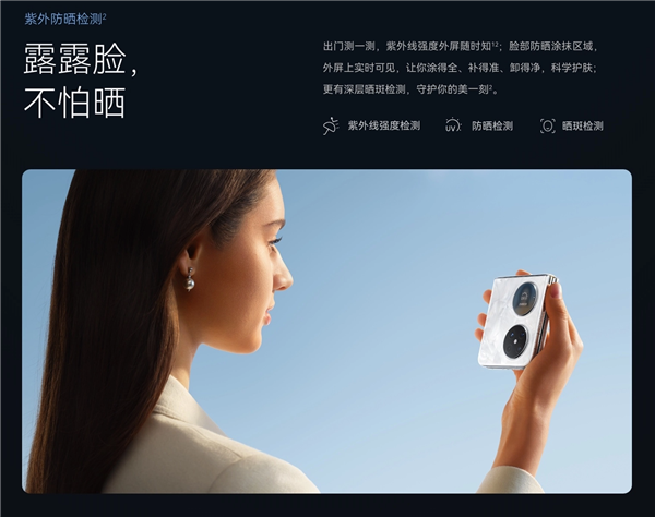 此外,华为Pocket 2还支持智感支付功能,用户无需打开任何应用或二维码,只需将手机屏幕对准扫码机,即可自动展示付款码并完成支付,便捷至极。华为Pocket 2还内置了第二代超光谱摄像头,具备行业领先的紫外感光能力。这一强大的摄像头不仅可以精确检测紫外线强度,还能监测化学防晒霜的涂抹情况,帮助用户在夏日更好地保护肌肤健康。