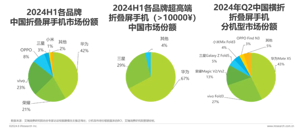 事实上,华为在折叠屏领域的布局可谓深远且全面,是唯一手握三种折叠形态的厂商。无论是竖向折叠、横向内折、横向外折,华为都是行业领跑者。余承东曾自豪地表示:“华为折叠屏的对手是我们自己。”这句话不仅是对华为自身实力的肯定,更是对其在折叠屏领域持续创新精神的生动诠释。如今随着三折叠手机华为Mate XT 非凡大师的问世,华为进一步补全了折叠家族的终极形态,成为唯一一家形态最全同时受众人群最广的手机厂商。折叠屏引领高端手机破局 中国市场“一极多强”艾瑞咨询公布的《2024年中国折叠屏手机市场与消费趋势研究报告》显示,尽管行业整体面临瓶颈,但高端手机市场凭借创新技术正引领行业破局,其中折叠屏手机以其迅猛的增长势头成为重要推动力。全球范围内,除苹果外,所有头部手机厂商均已积极布局折叠屏手机市场,目前,折叠屏手机在市场上的认知度已达到较高水平,消费者对这一新兴产品形态的接受度不断提升。众多消费者在亲身体验后发现,折叠屏手机不仅外观时尚、闭合紧密,其机身轻薄的设计也成为了新的亮点。与传统直板手机相比,现代折叠屏手机在观感和体验上已越来越接近,彻底颠覆了人们对早期折叠屏手机笨重形象的固有印象。