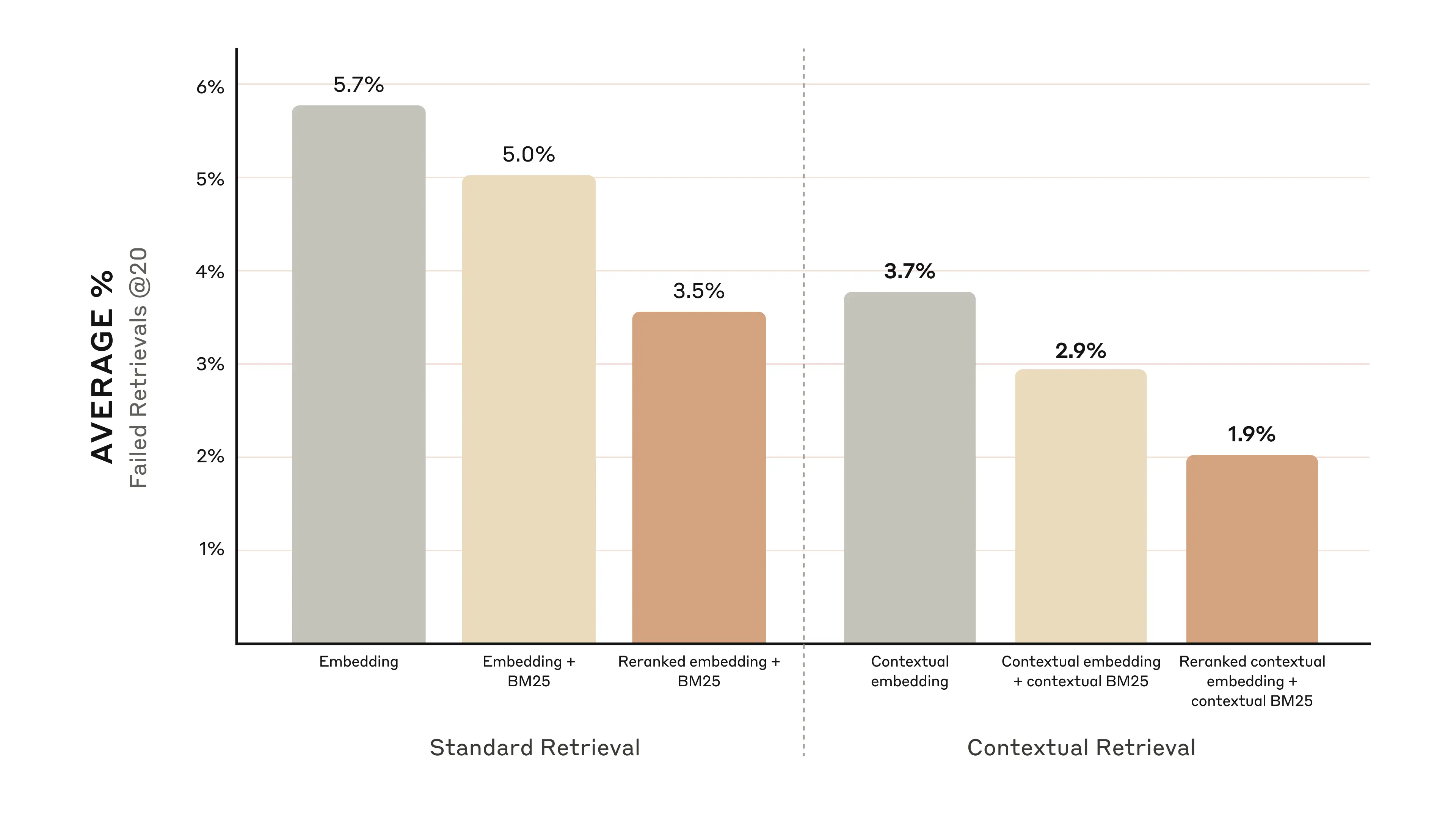 Contextual Retrieval embeddings + contextual BM25,检索失败几率降低 49%。