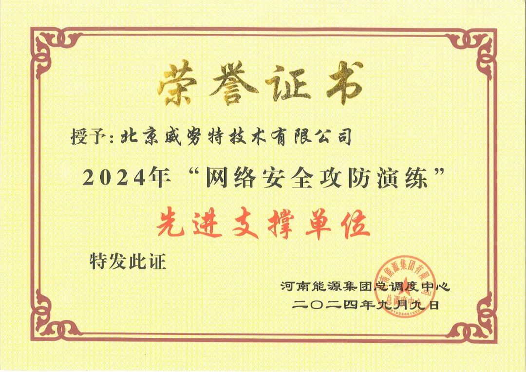 近日,河南能源集团网络安全实战攻防演练落下帷幕。威努特作为网络安全领军企业,在此次演练中凭借出色的表现和卓越的攻防能力,被评为2024 年“网络安全攻防演练”先进支撑单位。同时,威努特的两名攻防技术专家荣获“先进个人”称号。