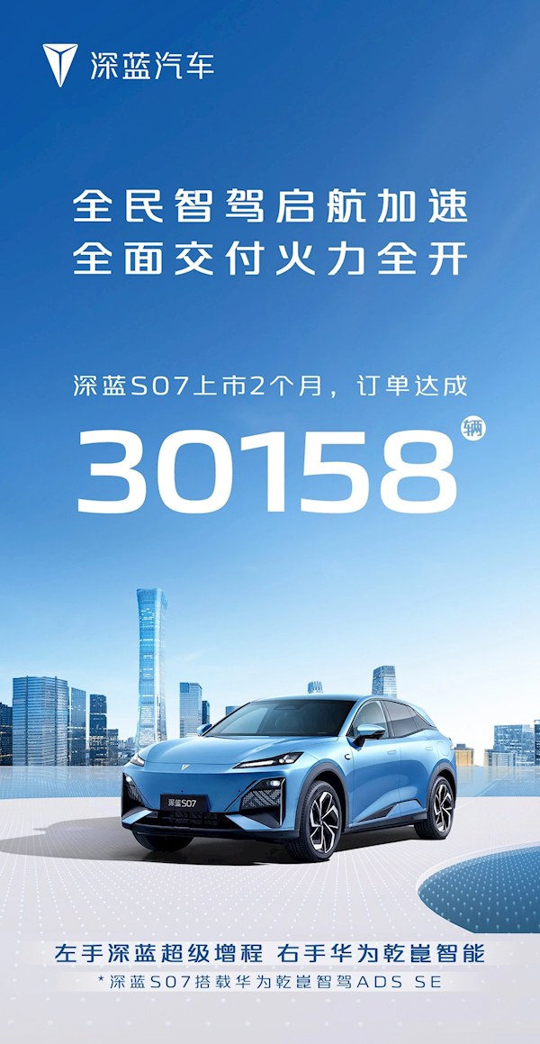 快科技9月25日消息,深蓝汽车宣布,其最新车型深蓝S07自7月上市以来,在短短两个月内订单量已达到30158辆。