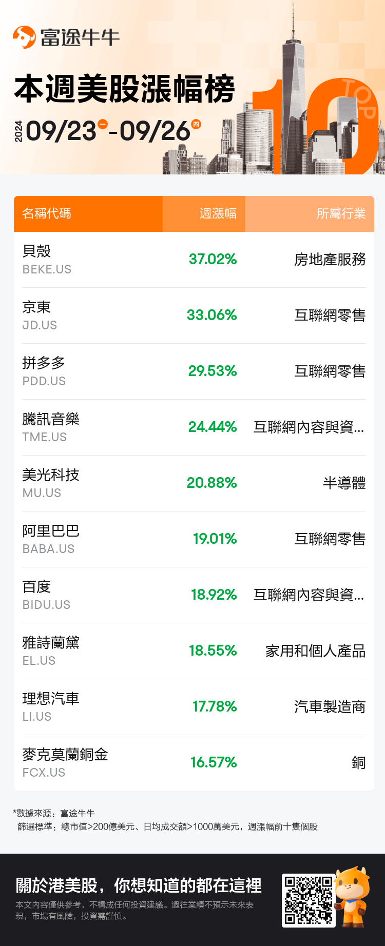 具体个股方面,中国资产“大狂欢”,高盛、大摩、瑞银、野村等大行齐齐看多!贝壳 (BEKE.US)、京东 (JD.US)本周纷纷涨超33%,拼多多 (PDD.US)累涨近30%,腾讯音乐 (TME.US)涨超24%,阿里巴巴 (BABA.US)、百度 (BIDU.US)涨近20%,理想汽车 (LI.US)涨超17%。