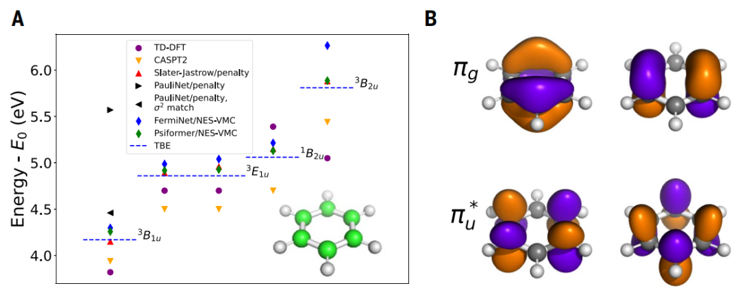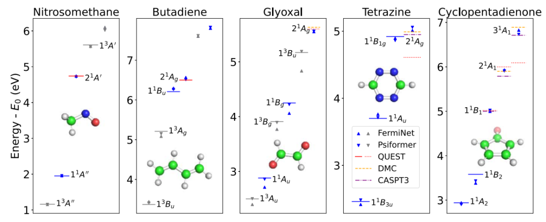 最后,作者研究了苯分子,图6中的NES-VMC结合Psiformer波函数与理论最佳估计相比,表现出显著更好的一致性,超越了包括使用罚项方法的神经网络波函数。这不仅验证了作者方法在数学上的正确性,也表明神经网络可以在当前计算方法的极限下准确表示分子的激发态。