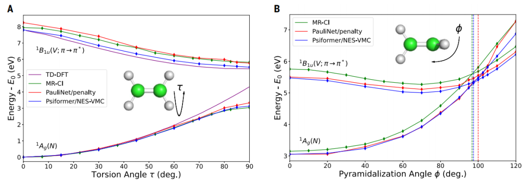 作者计算了乙烯在扭转角从0°到90°变化时的激发态,然后锥体化角从0°到120°的变化,足以包括N态和V态的锥形交点。图4中的结果显示,NES-VMC正确描述了扭曲分子的锥形交叉,并与高度精确的多参考配置相互作用(MR-CI)结果高度一致。