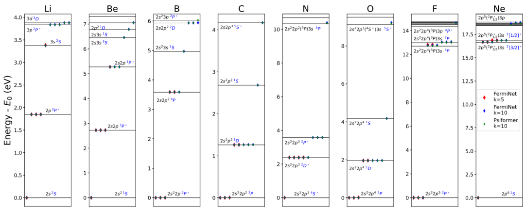 如图1所示,为了研究波函数选择以及计算状态数k的影响,作者使用FermiNet进行了包含5个和10个状态的计算,并使用Psiformer进行了包含10个状态的计算。