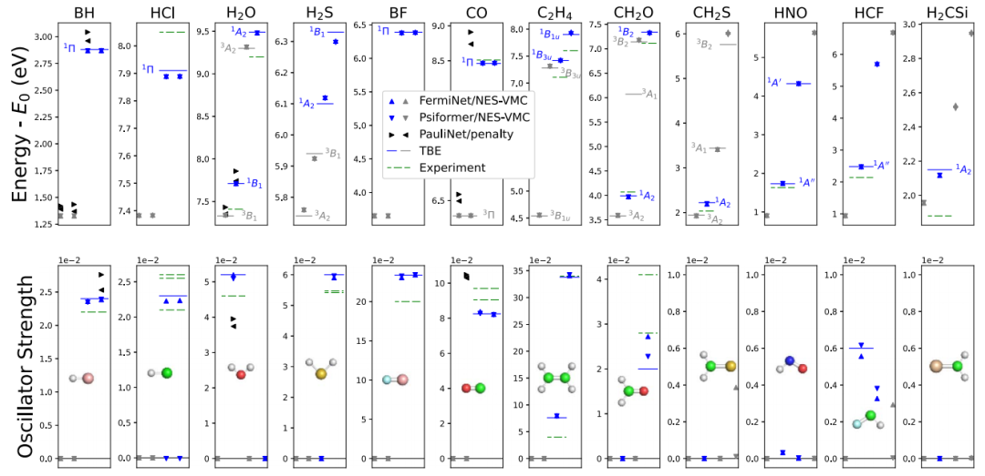 在图2中,作者将NES-VMC应用于Chrayteh等人研究的所有小分子,使用FermiNet和Psiformer计算了五个最低能量状态以及所有跃迁的振子强度。作者验证了NES-VMC在第一周期元素原子上的准确性,结果与实验结果非常接近,并在一系列小分子上获得了与现有最佳理论估计相当的高精度能量和振子强度。